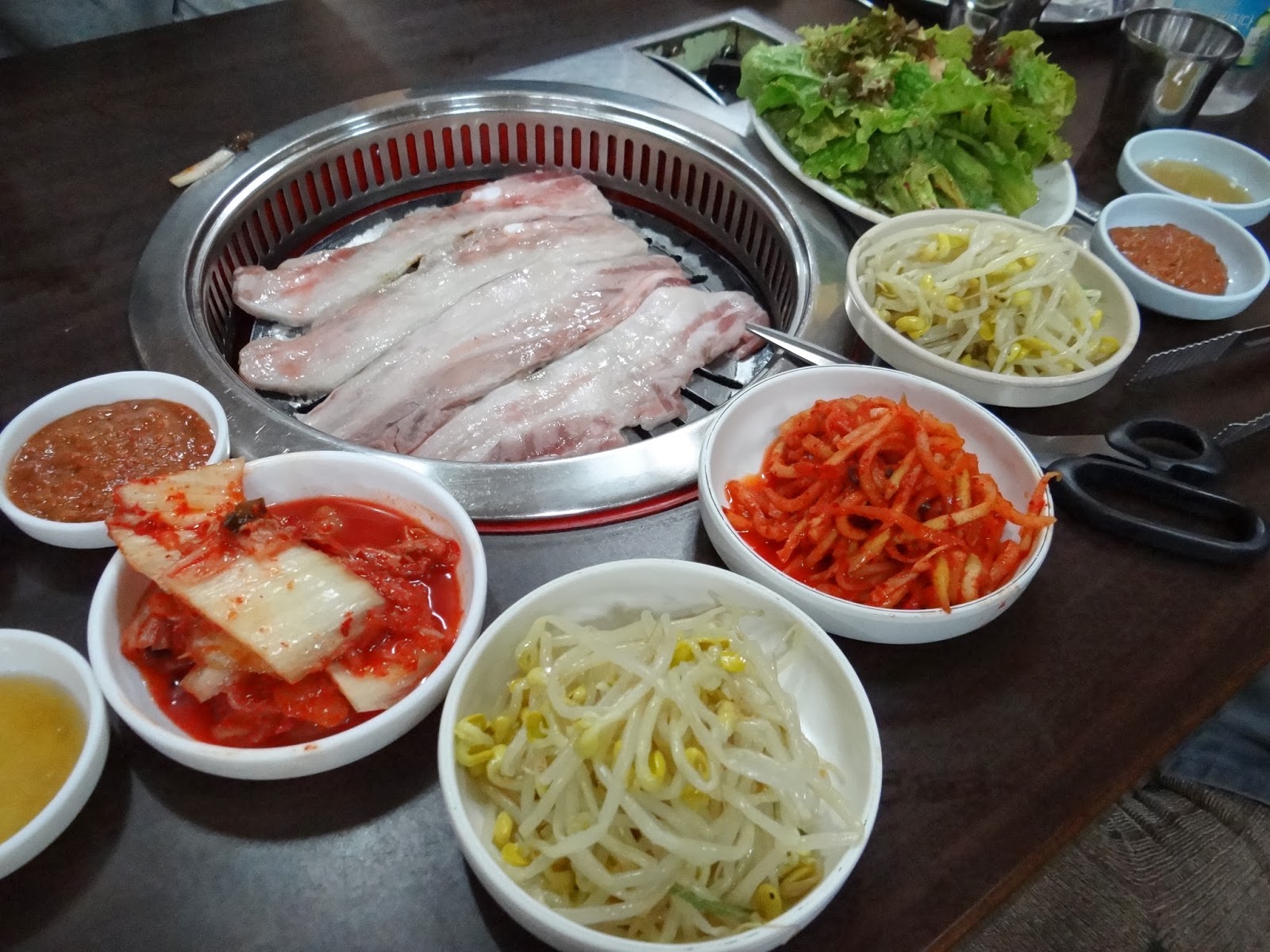 Finally it was dinner time and Warren, our leader, took us to a hole-in-the-wall Korean BBQ restaurant in a marketplace.  They ordered some makgeolli, a rice based alcoholic drink, which was really good, and then they grilled the pork on the circular BBQ in the middle of the table.  I had the tofu soup which was spicy and delicious!